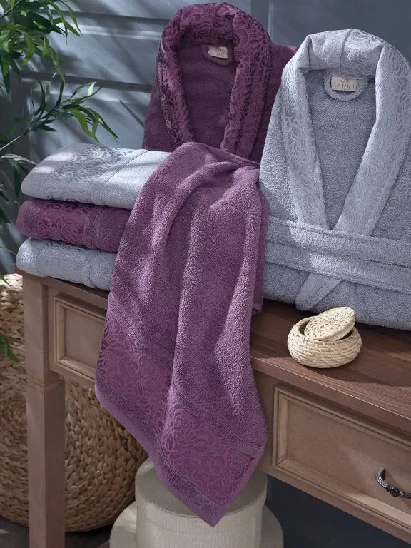Home Bornoz ve Aile Setleri Aile Bornoz Takımı Esra Gri-Mürdüm Jakarlı %100 Pamuklu Aile Bornoz Seti