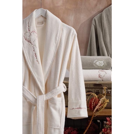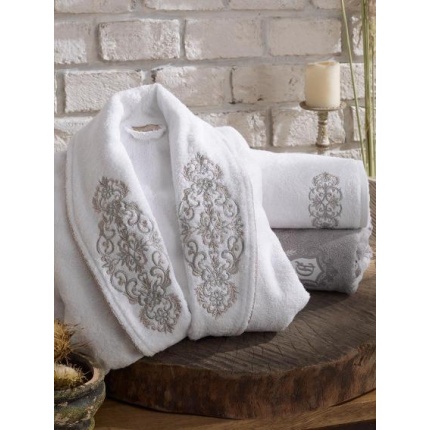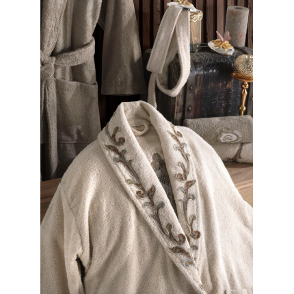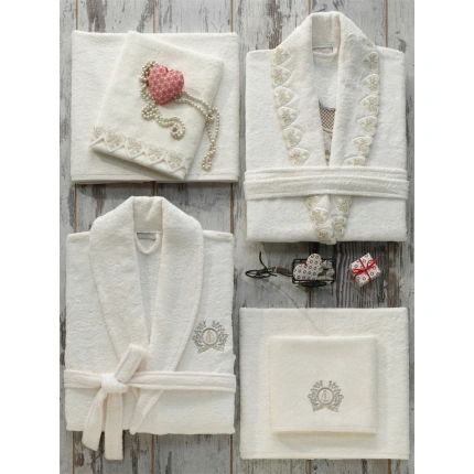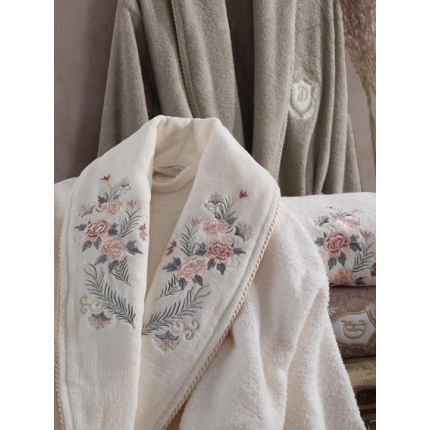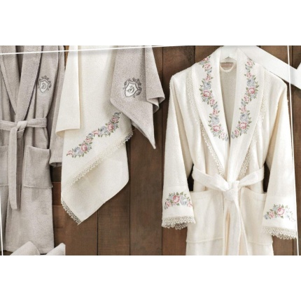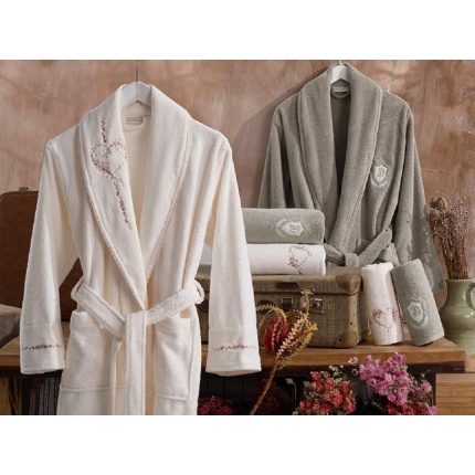 Victoria Krem-Gri Pamuklu Nakışlı Çeyizlik Aile Bornoz Takımı