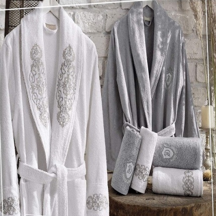 Bornozlar: Bu sette bulunan bornoz, pamuklu bir dokuya sahip şık ve rahat bornozlardır. Pamuk, bornozların yumuşak ve cilde dost bir dokuya sahip olmasını sağlar. Sizi banyo sonrası sıcak ve rahat bir şekilde sararlar.