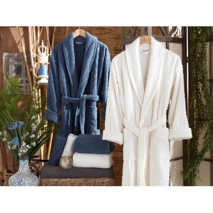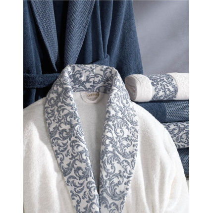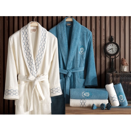 Victoria Krem-Lacivert Pamuklu Nakışlı Çeyizlik Aile Bornoz Takımı
