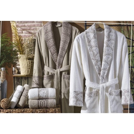 Sarmaşık Krem-Bej Pamuklu Nakışlı Çeyizlik Aile Bornoz Takımı